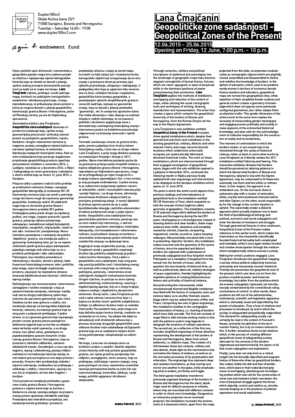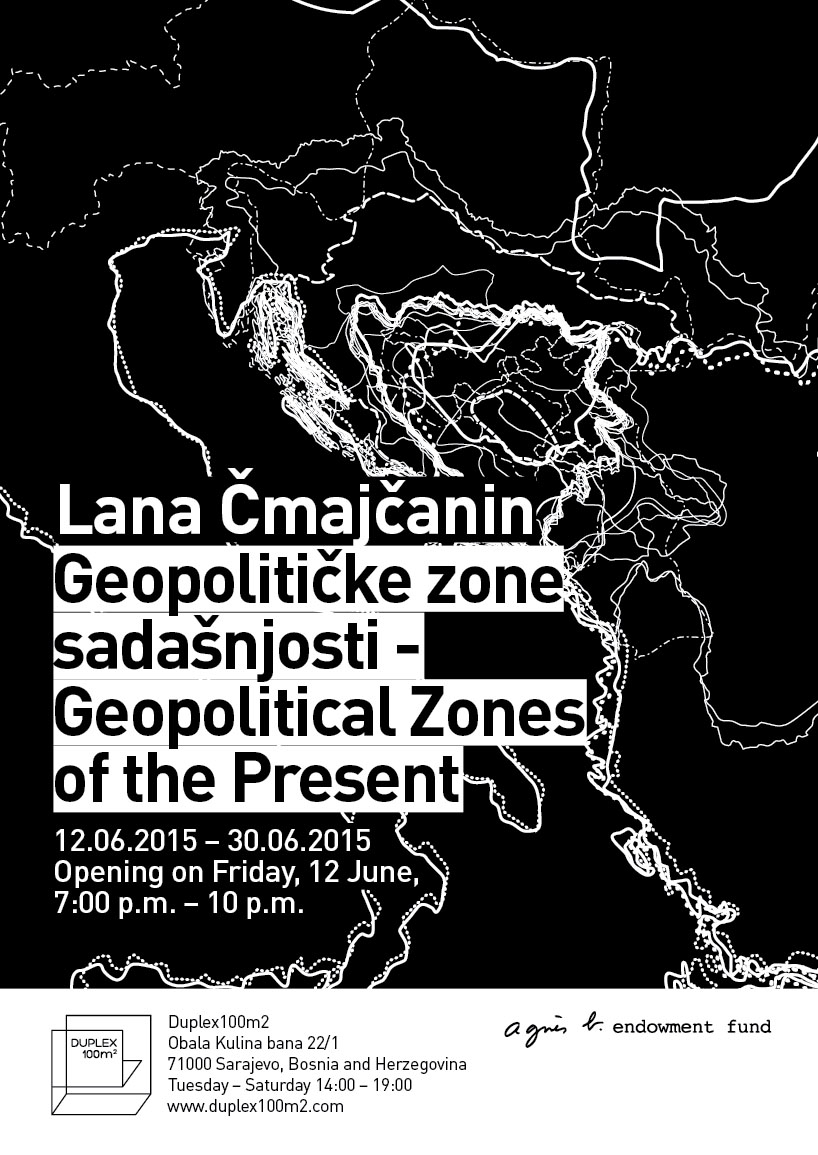 Lana Čmajčanin’s solo exhibition entitled Geopolitical Zones of the Present includes three spatial installations which, despite their geometrical precision and rootedness in the existing geopolitical, military, didactic and other relevant charts and maps, become blurred locations which undermine universally accepted, yet systematically fabricated, dominant historical truths. The work on these installations, which are interconnected through their engaged investigation of geopolitical space, began with the solo exhibition opened in Ljubljana in November 2014, continued the following month in Rijeka and was finally updated with new engravings and interventions to be displayed at the Sarajevo exhibition which opens on 12 June 2015.